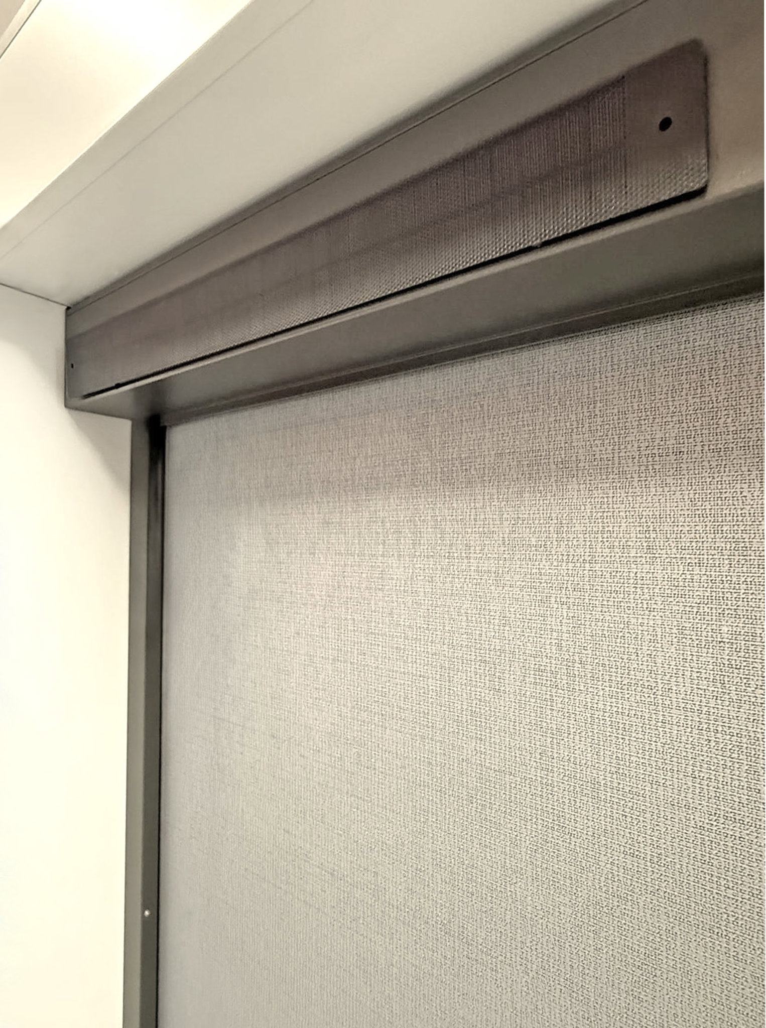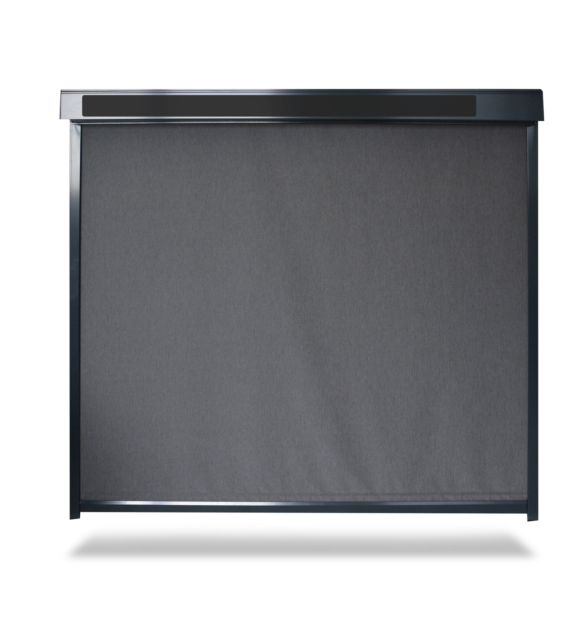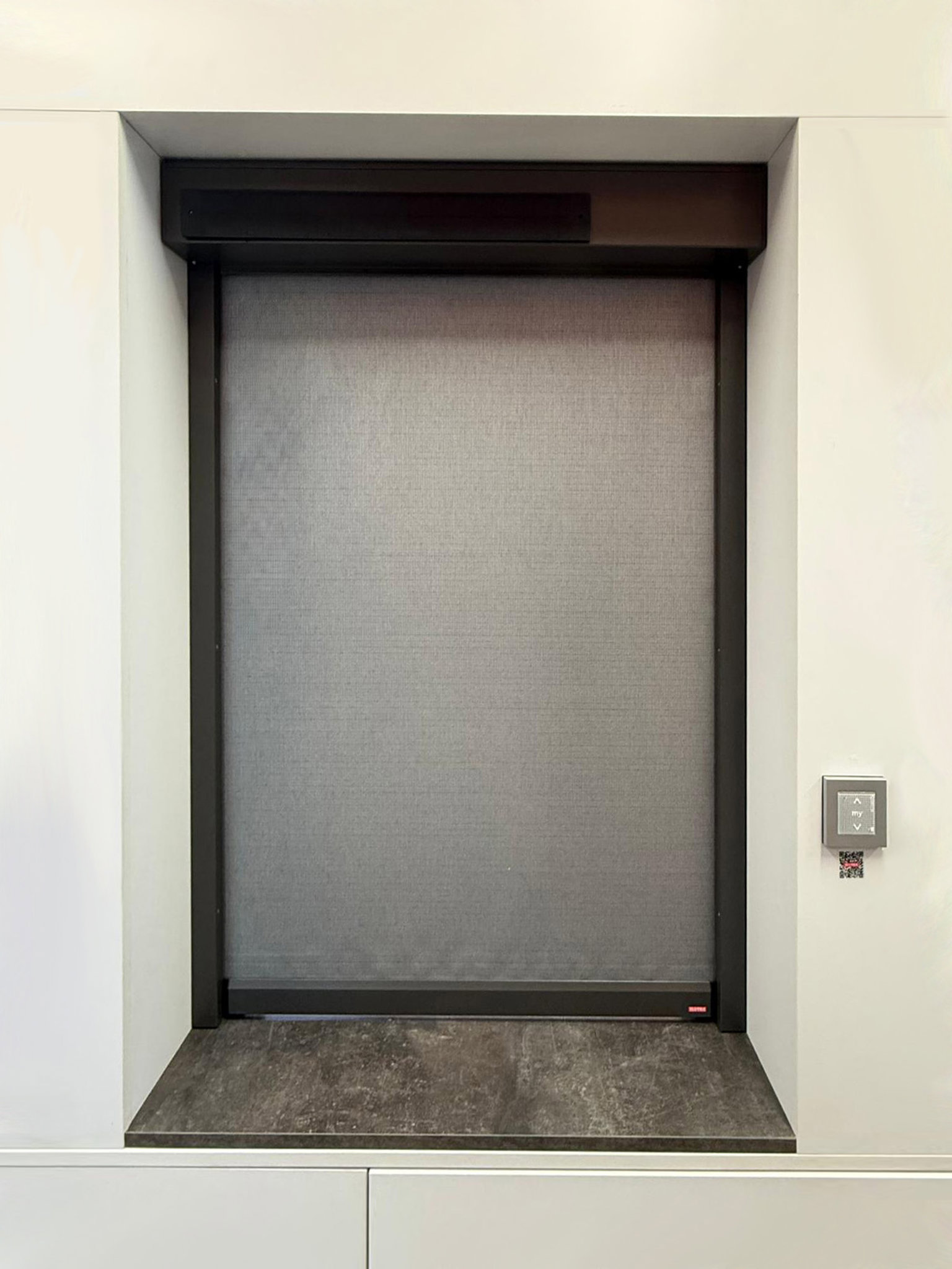 Dieses Rollo verfügt über ein einzigartiges System von Leisten, das eine hohe Windfestigkeit gewährleistet und den Textilstoff perfekt straff und an seiner Stelle in den Führungsleisten hält. Der Kasten kann mit zum Design des Kastens passenden Montagehaltern vor einer Fensteröffnung an die Fassade oder in eine Fensteröffnung in die Fensterleibung montiert werden, wobei zwischen ihnen und dem Kasten kein Spalt entsteht.
